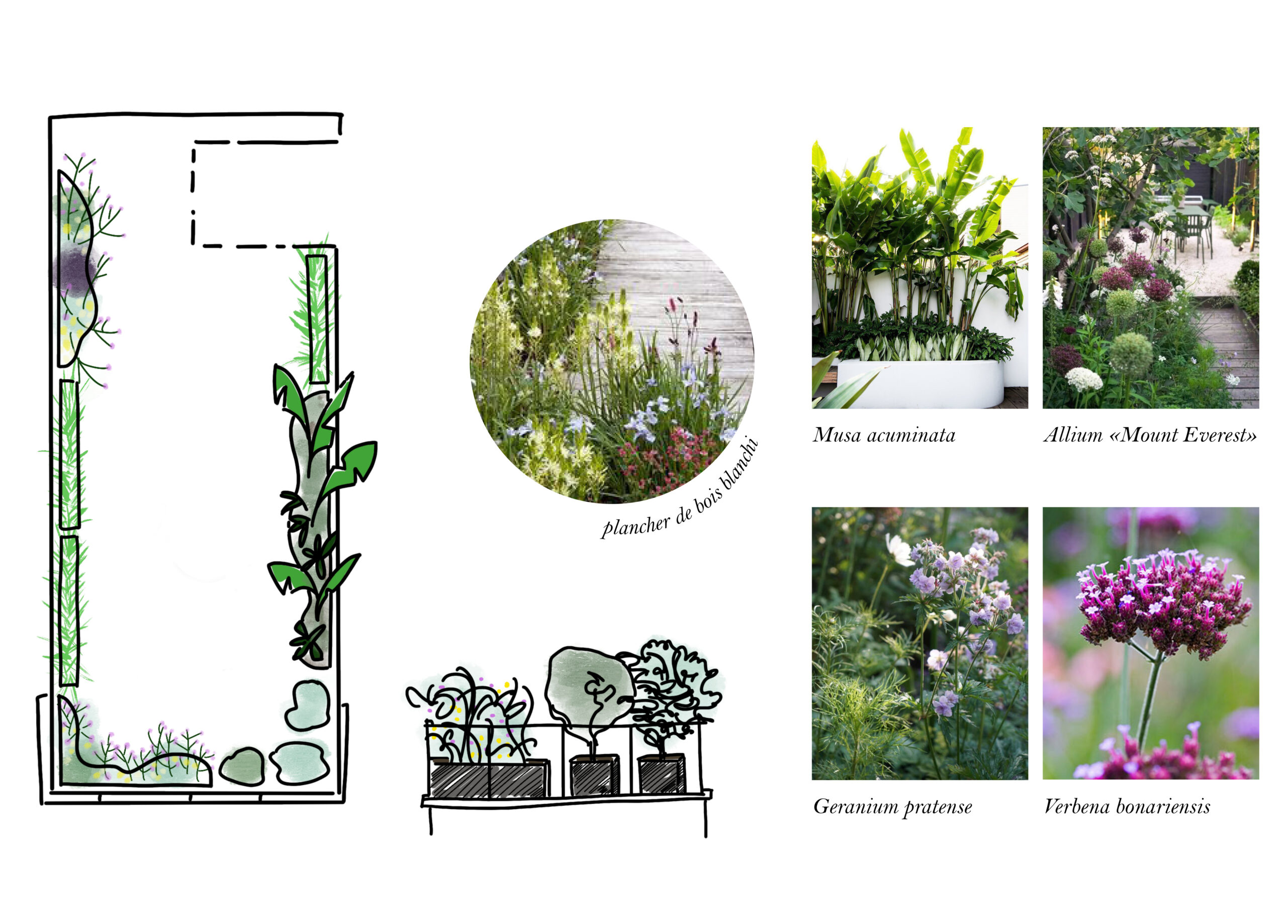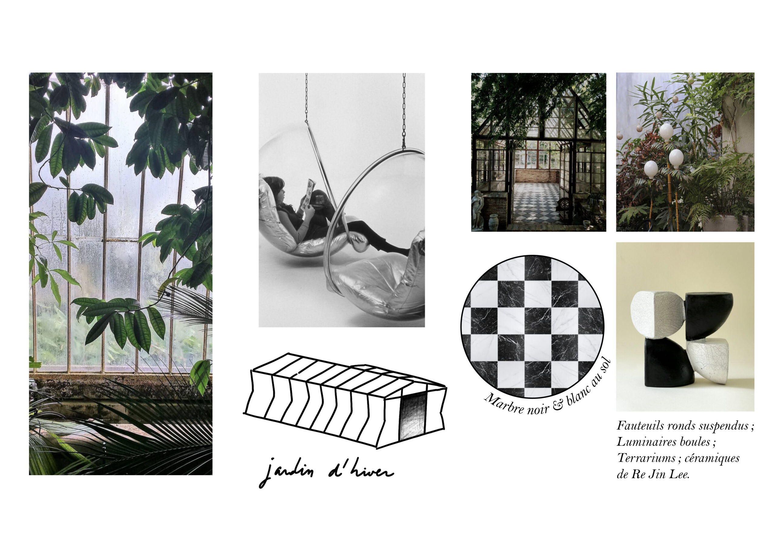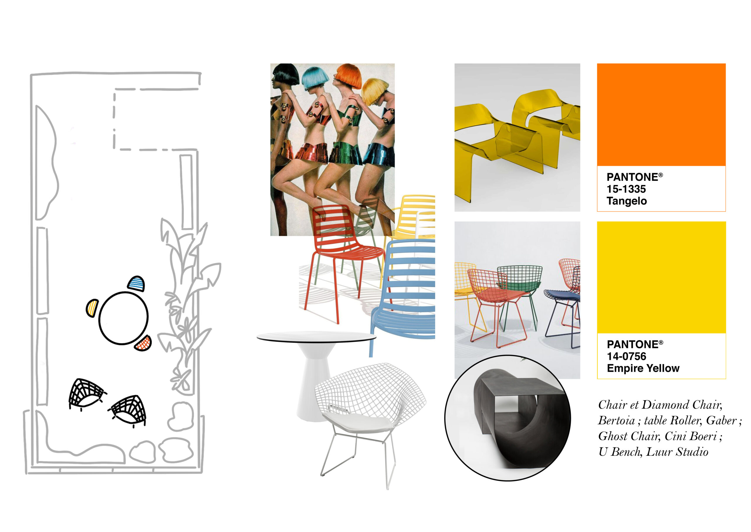 Le concept s’illustre par des croquis, des photos et des moodboards mobiliers et paysagers.