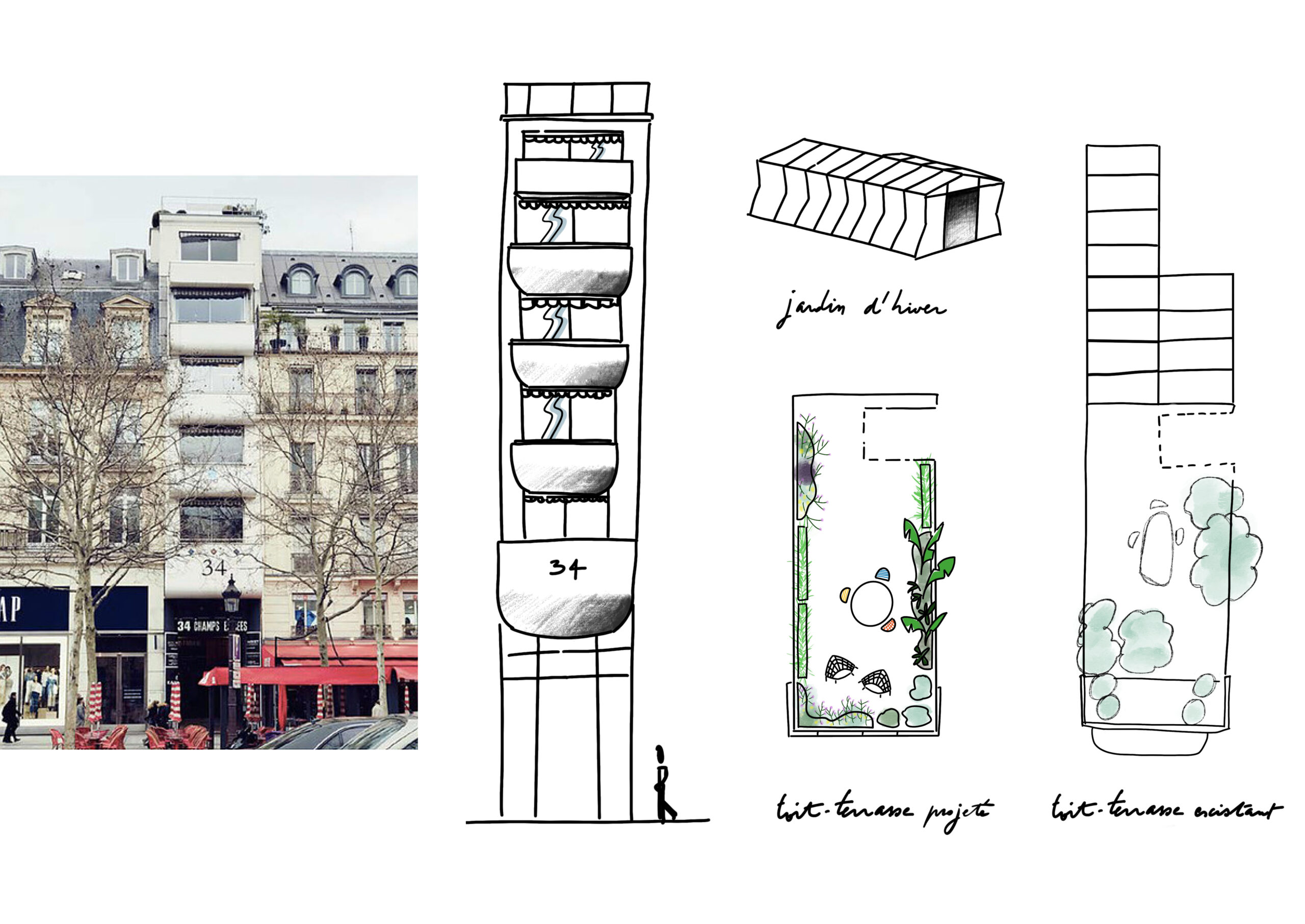 34 COURREGES est un projet mêlant design intérieur et étude paysagère. Il décrit l’aménagement d’un toit-terrasse et d’un jardin d’hiver, situés à une adresse  «imaginée» des Champs-Élysées.