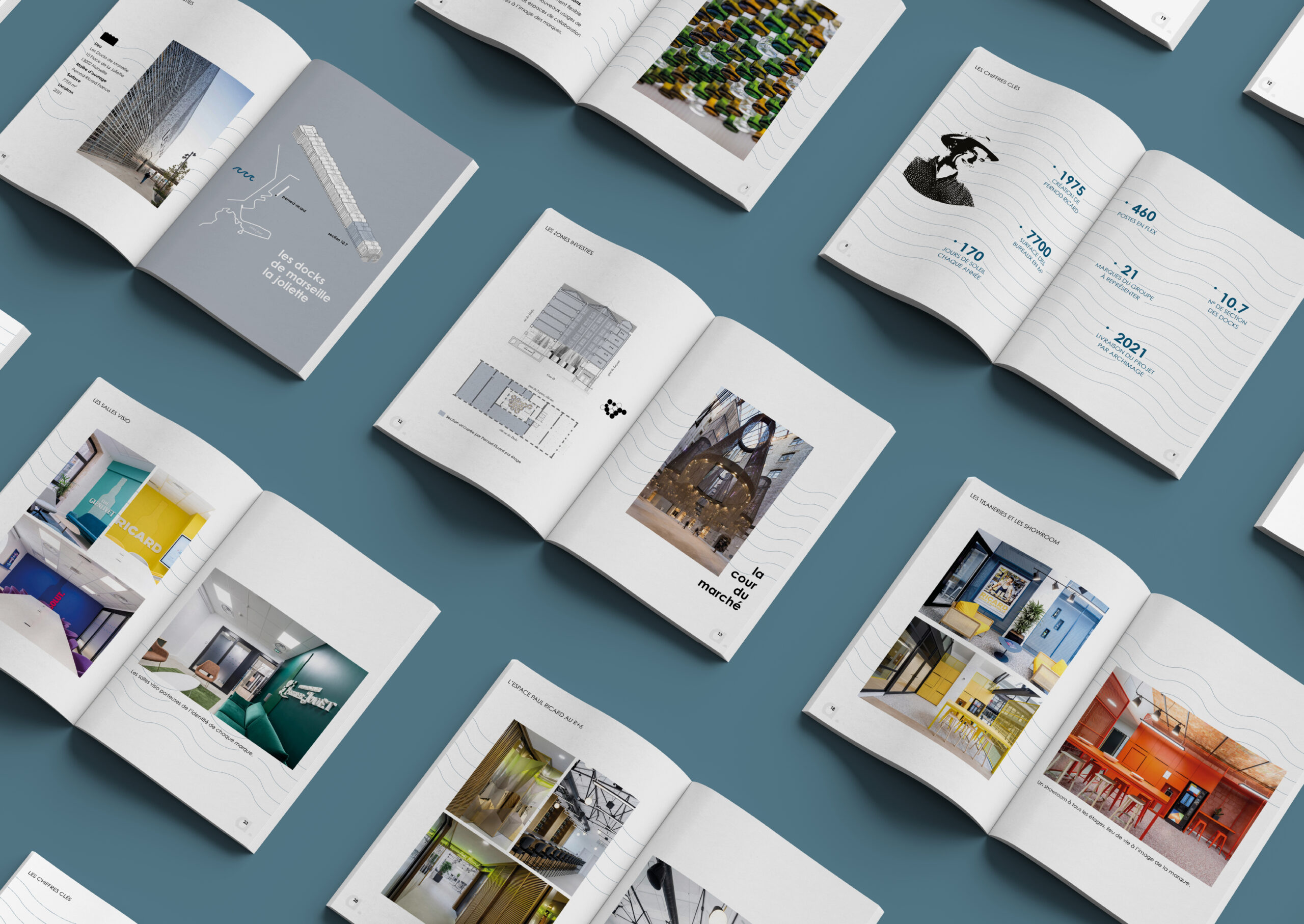 Ce dossier revient sur les chiffres clés, les zones investies avec plans et coupes, la localisation. Il est surtout destiné à montrer les différents espaces de travail et de convivialité, tels que la cafétéria, les salons, les salles visio, les tisaneries et les showroom, La Distillerie au R+4, ou encore, l’espace Paul Ricard, lieu de conférence, de rencontres au R+6.